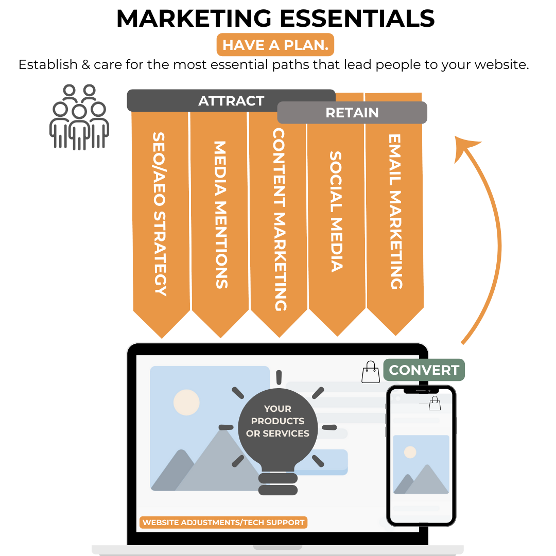 Our Marketing Essentials Package provides all of your foundational, interconnected marketing needs after your website is launched, including: